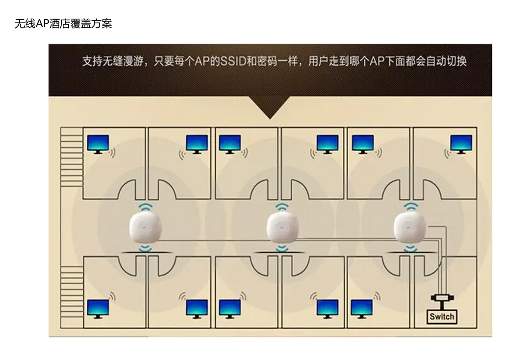 1、酒店内布局较规律,需满足各客房的无线全覆盖,无盲区;